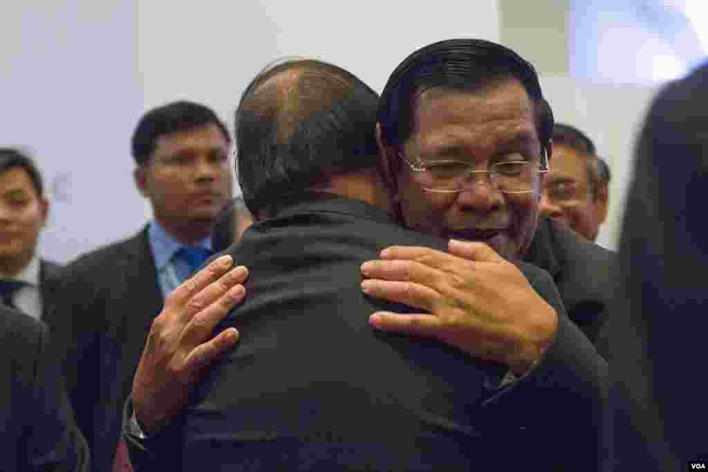 លោកនាយករដ្ឋមន្ត្រី ហ៊ុន សែន និងនាយករដ្ឋមន្ត្រីប្រទេសវៀតណាម លោក Nguyen Xuan Phuc នៅក្នុងវេទិកាសេដ្ឋកិច្ចពិភពលោកអំពីអាស៊ាន នៅរាជធានីភ្នំពេញ ថ្ងៃទី១២ ខែឧសភា ឆ្នាំ២០១៧។ (ខាន់ សុគុំមនោ/VOA)