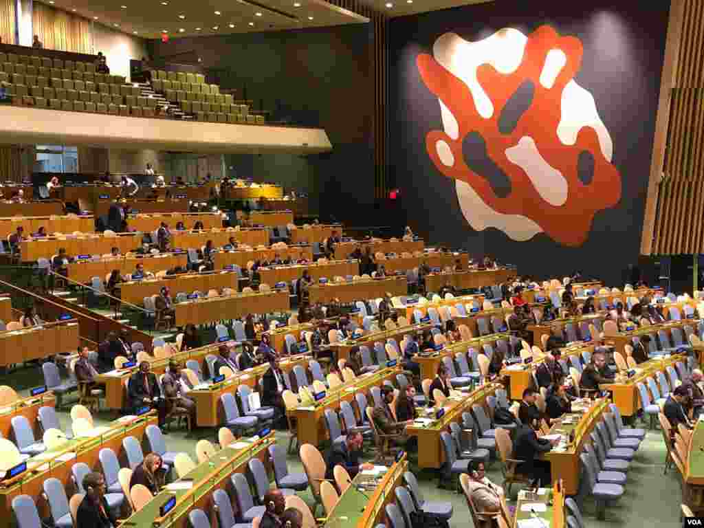 ទិដ្ឋភាពទូទៅមួយនៃមហាសន្និបាតអង្គការសហប្រជាជាតិលើកទី៧៣ ក្នុងទីក្រុងញូវយ៉ក នៅថ្ងៃទី២៨ ខែកញ្ញា ឆ្នាំ២០១៨។ (ស៊ុន ណារិន/VOA)