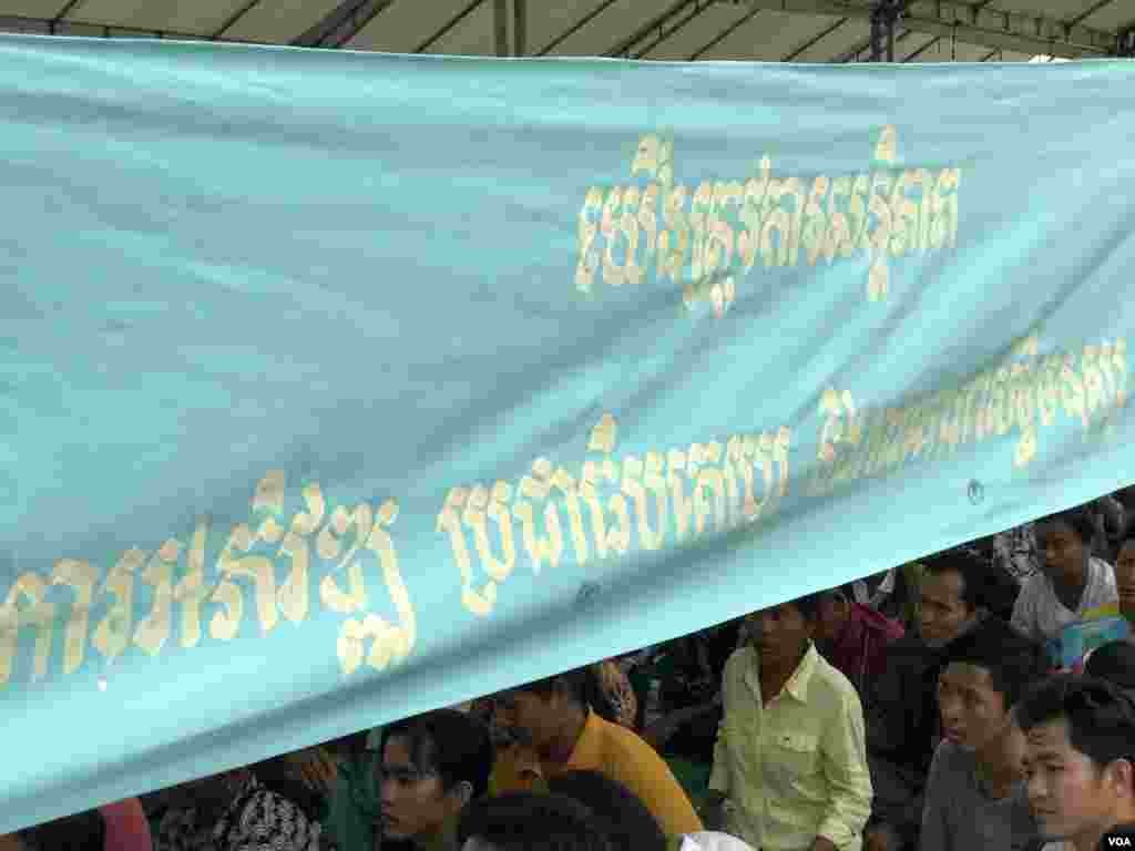 ទាំងបដាអំពាវនាវឲ្យមានការអភិវឌ្ឍន៍ លទ្ធិប្រជាធិបតេយ្យ និងសិទ្ធិមនុស្ស ក្នុងថ្ងៃរំឭកខួបទី២៨ឆ្នាំនៃការចុះកិច្ចព្រមព្រៀងទីក្រុងប៉ារីស នៅទីក្រុងភ្នំពេញថ្ងៃទី២៣ តុលា ឆ្នាំ២០១៩។ (ហ៊ុល រស្មី/VOA)