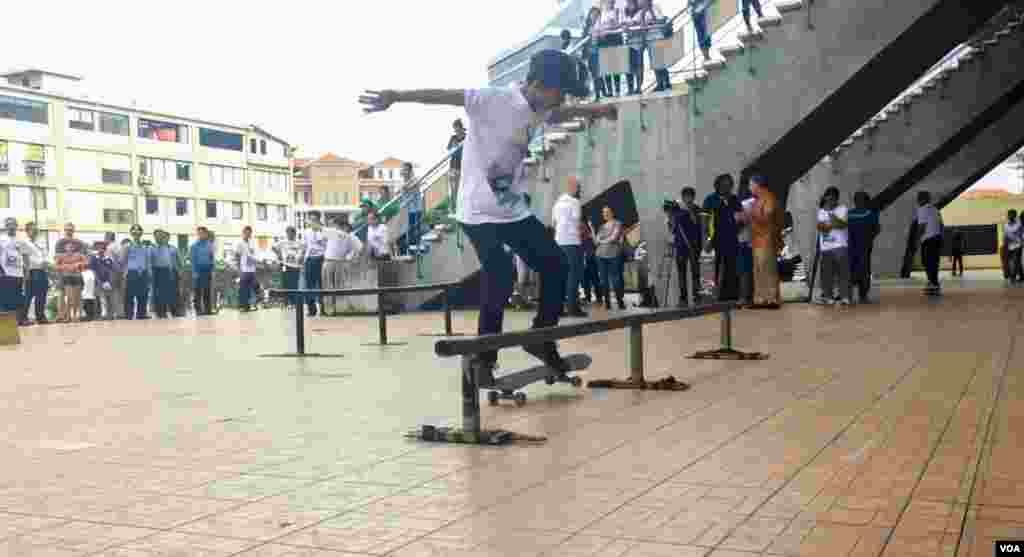 យុវជនបង្ហាញសមត្ថភាពលេងកីឡាក្តាររំអិលរបស់ខ្លួន នៅពហុកីឡាដ្ឋានជាតិអូឡាំពិច កាលពីថ្ងៃទី៥ ខែសីហា ឆ្នាំ២០១៧។ (រ៉ាវី សុភារ័ត្ន/VOA)