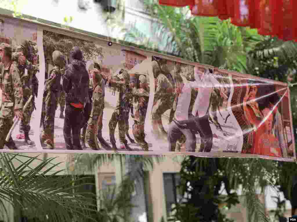 បដារូបភាពនៃការវាយប្រហាររបស់ក្រុមទាហានមកលើសកម្មជនកាលពីដើមឆ្នាំ២០១៤។ (ហ៊ុល រស្មី/VOA)