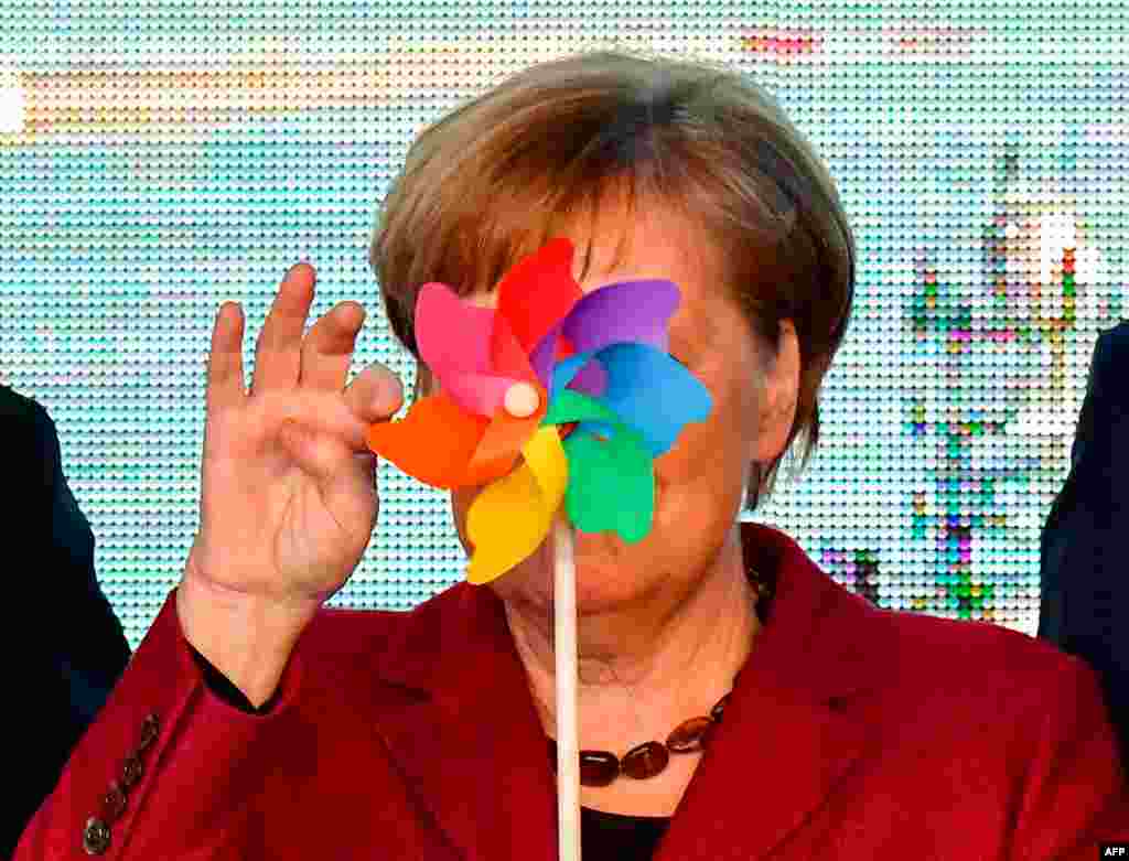 អធិការបតីអាល្លឺម៉ង់លោកស្រី Angela Merkel លាក់មុខក្រោយកង្ហារក្រដាសក្មេងលេង ខណៈពេលឈរថតជាមួយក្មេងៗ អំឡុងពេលបើកពិធីមួយនៅឧទ្យាន Arkona នៅក្រុង Sassnitz ភាគខាងជើងប្រទេសអាល្លឺម៉ង់។
