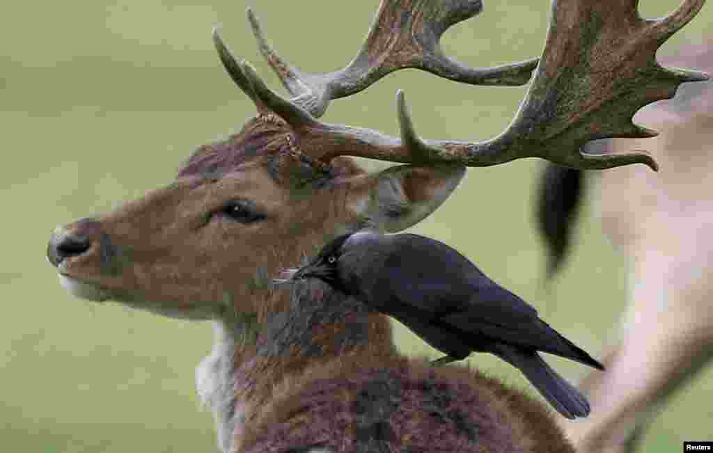 បក្សីមួយក្បាលដករោមពីខ្នងរបស់សត្វក្តាន់ក្នុងសួន Bushy ទីក្រុងឡុងដ៏ ប្រទេសអង់គ្លេស។