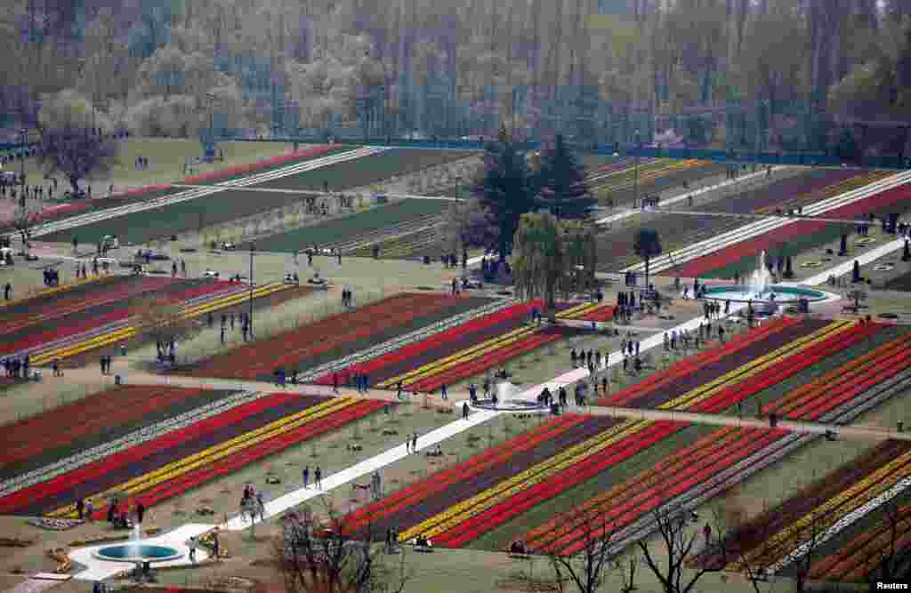 មនុស្សម្នាដើរនៅក្នុងសួនផ្កាមួយនៅក្នុងក្រុង Srinagar ប្រទេសឥណ្ឌា កាលពីថ្ងៃទី៣ ខែមេសា ឆ្នាំ២០១៧។