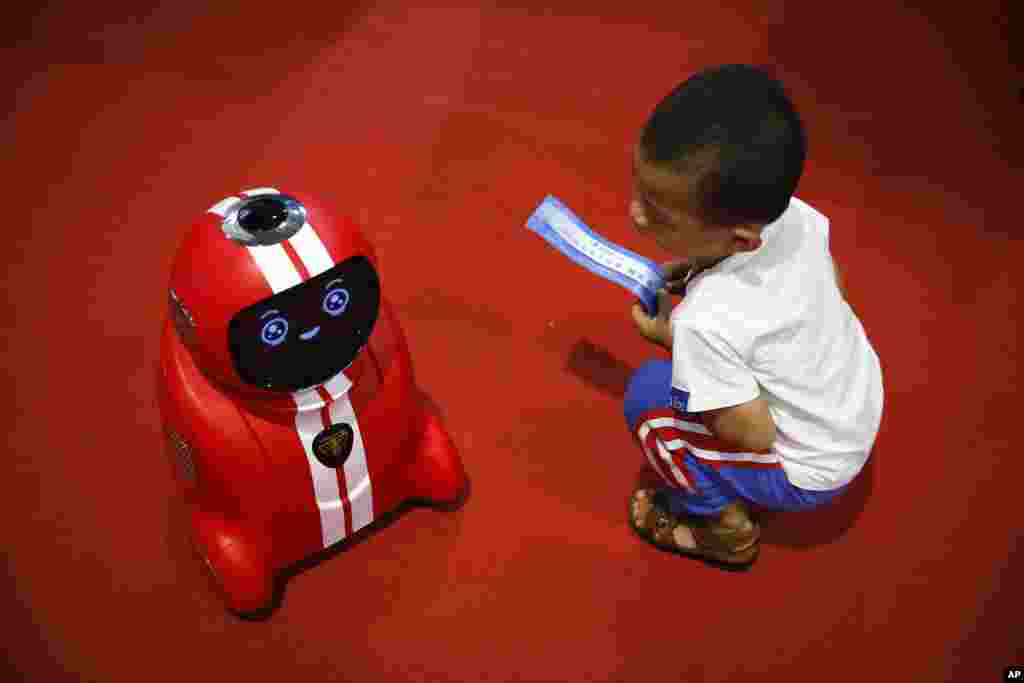កុមារម្នាក់អង្គុយមើលមនុស្សយន្តវ័យឆ្លាតមួយក្នុងសន្និសីទមនុស្សយន្តពិភពលោកក្នុងពិព័រណ៌និងសន្និសីទអន្តរជាតិ Yichuang ក្នុងទីក្រុងប៉េកាំងប្រទេសចិន។