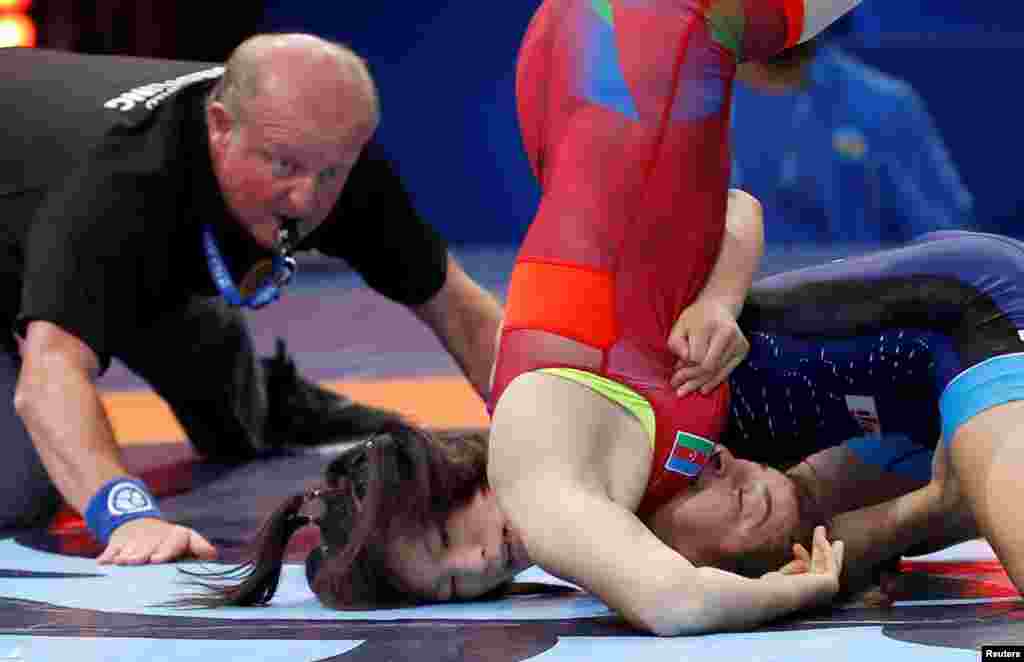 នាង Yukako Kawai នៃប្រទេសជប៉ុនប្រកួតជាមួយនាង Elmira Gambarova នៃប្រទេសអាស៊ែបៃហ្សង់ក្នុងវគ្គកីឡាបោកចំបាប់នារីទម្ងន់៦៣គីឡួក្រាមនៃការប្រកួតជើងឯកបោកចំបាប់ពិភពលោក FILA នៅក្នុងទីក្រុងប៉ារីសប្រទេសបារាំង។