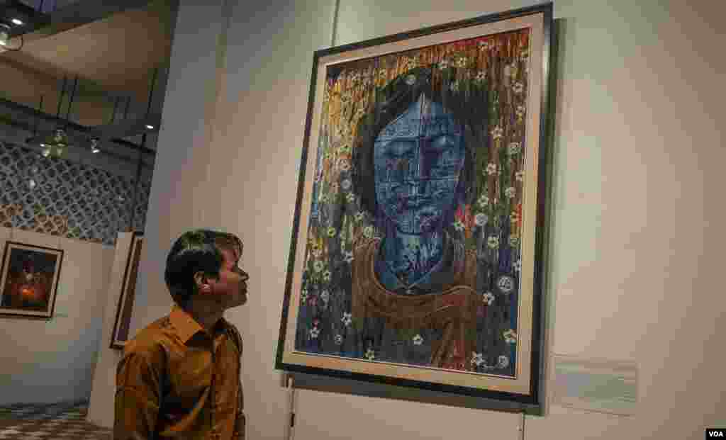 សាធារណជនសញ្ជឹងមើលផ្ទាំងគំនូររបស់ វិចិត្រករ សាង ណាន់ ដែលបង្ហាញនូវភាពឈឺចាប់ និងក្តីសង្ឃឹមរបស់ប្រជាជនខ្មែរដែលបានរស់ក្នុងសម័យខ្មែរក្រហម និងតស៊ូក្នុងជីវិតបច្ចុប្បន្ន។ គំនូរទាំង១១ ផ្ទាំងរបស់លោកត្រូវបានតាំងបង្ហាញនៅកម្មវិធីមហោស្រពភាពយន្តអន្តរជាតិកម្ពុជាលើកទី៩, នៅរាជធានីភ្នំពេញ, នៅថ្ងៃទី១២ ខែមីនា ឆ្នាំ២០១៩។ (ខាន់ សុគុំមនោ/VOA)