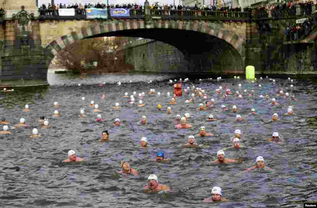 អ្នកហែលទឹកកំពុងចូលរួមប្រកួតហែលលទឹកសម្រាប់ពិធីបុណ្យគ្រីស្ទម៉ាស់ នៅទន្លេ Vltava ក្នុងទីក្រុងប្រាក សាធារណរដ្ឋឆែក។
