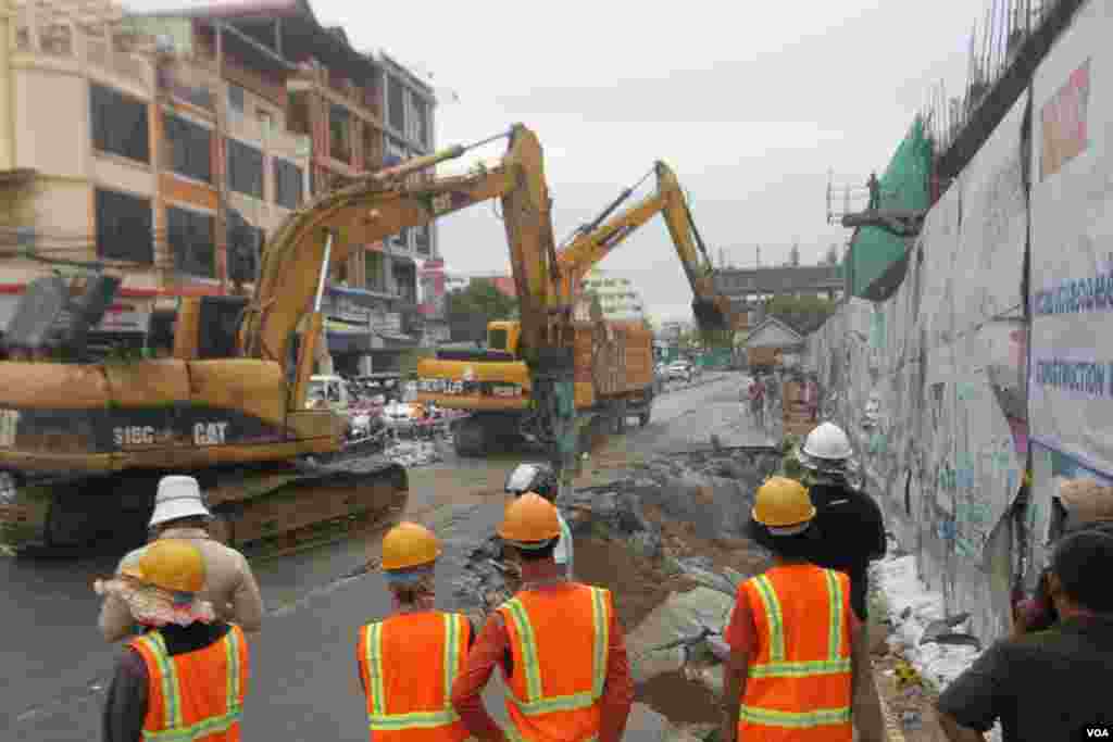 កម្មករសំណង់ឈរមើលរថយន្តអេស្កាវាទ័រជីកកកាយដី បន្ទាប់ពីរថយន្តបីគ្រឿងផុងស្រុត ខណៈពេលមានភ្លៀងធ្លាក់ជោគជាំនៅការដ្ឋានសំណង់នៅជាប់របងពហុកីឡាដ្ឋានជិតអូឡាំពិក ខណ្ឌប្រាំពីរមករា នៅថ្ងៃពុធ ទី០៧ខែ មិថុនា ឆ្នាំ២០១៦នេះ។ រថយន្តចំនួនបីគ្រឿងដែលគេចតចោលនៅបណ្ដោយផ្លូវជាប់ការរដ្ឋាននេះ ត្រូវក្រុមហ៊ុនការដ្ឋានសាងសង់ស្ទួចទៅឲ្យម្ចាស់ដើមវិញ។ (ឡេង ឡែន/VOA )