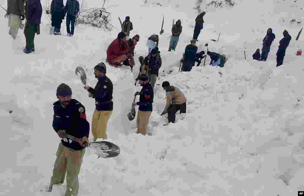 មន្ត្រីប៉ូលិសនិងប្រជាជនស្វែងរកសាកសពជនរងគ្រោះពីការបាក់ព្រិលសង្កត់ក្នុងភូមិ Doodnail ជ្រោះភ្នំ Neelum Valley តំបន់ Kashmir។