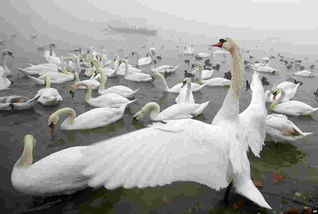 សត្វក្ងានប្រមូលផ្តុំនៅមាត់ទន្លេ Danube ក្នុងទីក្រុង Belgrade ប្រទេសស៊ែរប៊ី។