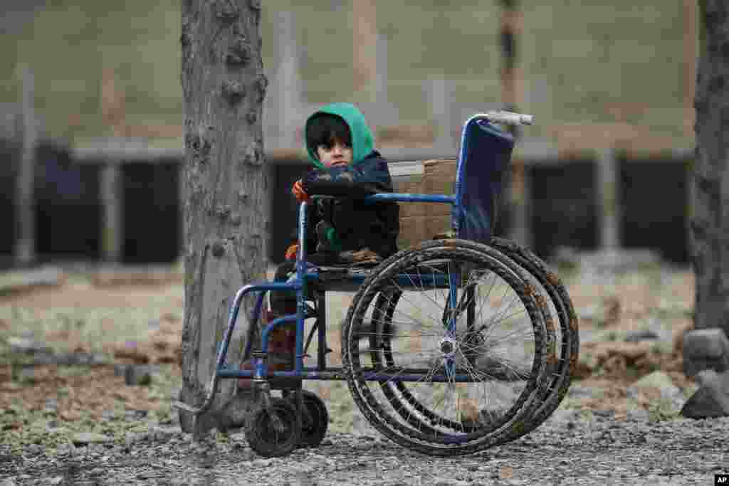 ក្មេងជនជាតិស៊ីរីម្នាក់អង្គុយនៅលើរទេះរុញ បន្ទាប់ពីគាត់និងក្រុមគ្រួសារបានឆ្លងចូលមកក្នុងទឹកដីប្រទេសតួកគី តាមច្រកព្រំដែនតួកគី-ស៊ីរី Oncupinar ដែលច្រកនេះត្រូវគេហៅជាភាសាអារ៉ាប់ថា Bab al Salameh នៅជាយក្រុង Kilis ប្រទេសតួកគី។