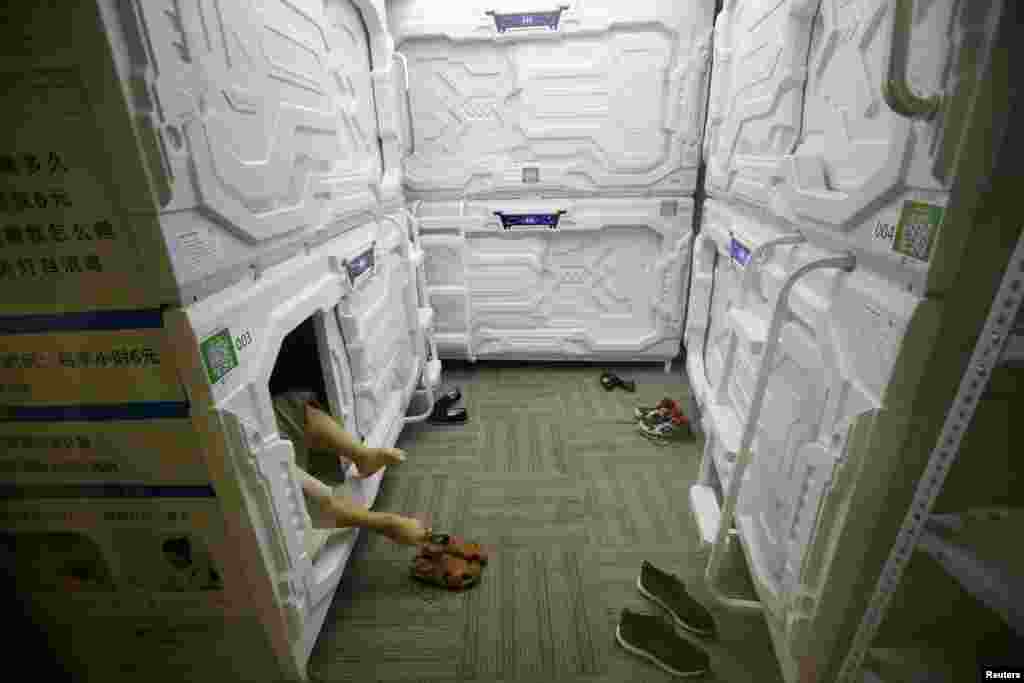 បុគ្គលិកបច្ចេកវិទ្យាម្នាក់ដោះស្បែកជើងចេញខណដែលលោករៀបចំចូលសម្រាកក្នុងគ្រែប្រអប់នៅ Xiangshui Spaceអំឡុងពេលសម្រាកថ្ងៃត្រង់ក្នុងតំបន់ Zhongguancun ទីក្រុងប៉េកាំងប្រទេសចិន។
