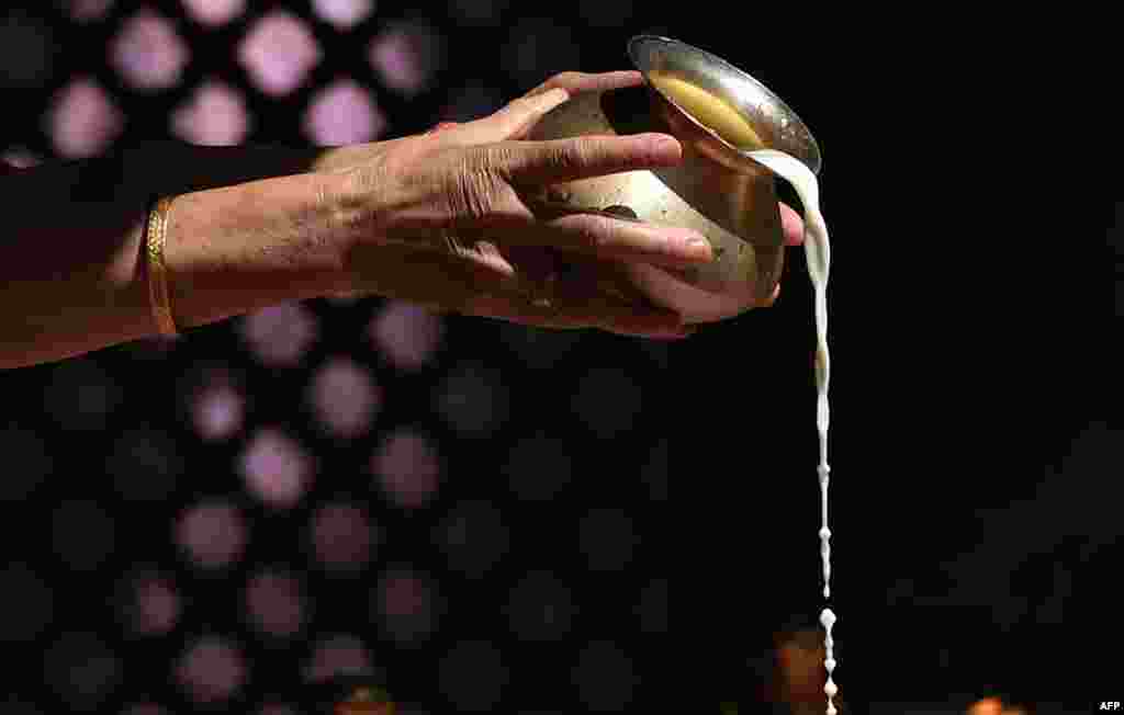 អាចារ្យមកពីតំបន់កាស្មៀរ ចាក់ទឹកដោះគោលើរូបចម្លាក់ព្រះក្នុងសាសនាហិណ្ឌូ ក្នុងកម្មវិធីបុណ្យប្រចាំឆ្នាំនៃសាសនាហិណ្ឌូ នៅវិហារ Khirbhawani ក្នុងភូមិ Tullamulla ស្ថិតនៅចម្ងាយប្រហែល៣០គ.ម ភាគខាងកើតនៃទីក្រុង Srinagar ប្រទេសឥណ្ឌា។