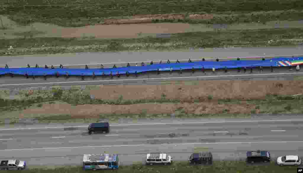 ពលរដ្ឋបូលីវីកាន់ទង់ជាតិរបស់ពួកគេនៅតាមមហាវិថីមួយនៅចន្លោះក្រុង Oruro និងក្រុង La Paz ប្រទេសបូលីវី កាលពីថ្ងៃទី១០ ខែមីនា ឆ្នាំ២០១៨។