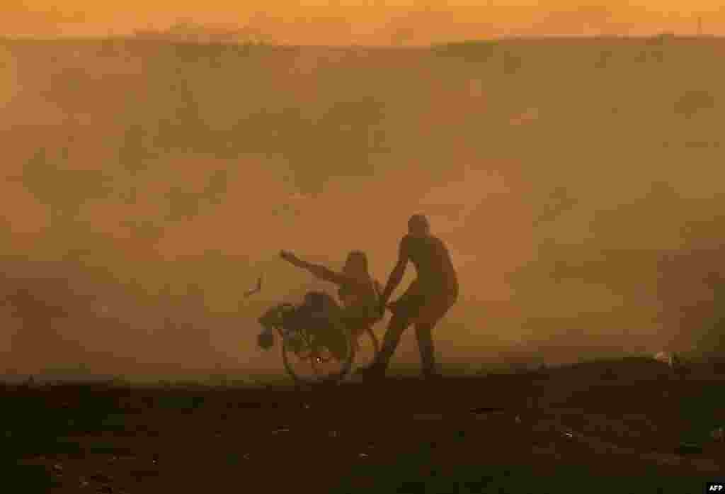 បាតុករជនជាតិប៉ាឡេស្ទីនម្នាក់កំពុងទាញរទេះរុញរបស់បាតុករជនជាតិប៉ាឡេស្ទីនម្នាក់ទៀត នៅពេលដែលបរិយាកាសពោរពេញដោយផ្សែងកើតចេញពីគ្រាប់បែកបង្ហូរទឹកភ្នែក ដែលបាញ់ដោយពួកកងកម្លាំងអ៊ីស្រាអែល ក្នុងការប៉ះទង្គិចនៅភាគខាងកើតនៃទីក្រុង Gaza City ជិតព្រំដែនជាមួយប្រទេសអ៊ីស្រាអែល។