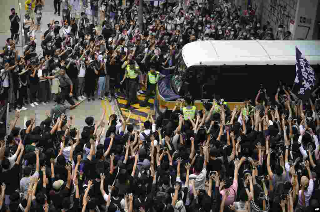ក្រុមអ្នកគាំទ្រឡោមព័ទ្ធរថយន្តប៉ូលិសមួយដែលមានដឹកសកម្មជននយោបាយ Edward Leung ខណៈដែលរថយន្តនេះកំពុងចាកចេញពីតុលាការកំពូលក្នុងទីក្រុងហុងកុងកាលពីថ្ងៃទី០៩ តុលា ឆ្នាំ២០១៩។