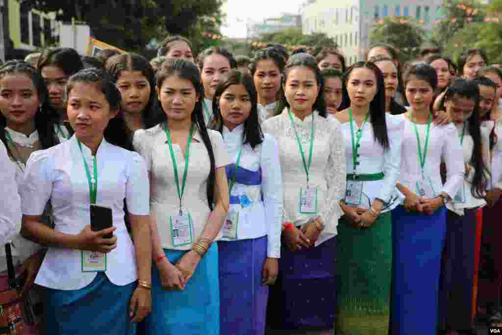 សិស្សសាលារង់ចាំការយាងចេញរបស់ព្រះបាទ នរោត្តម សីហមុនី បន្ទាប់ការប្រារព្ធទិវាបុណ្យឯករាជ្យជាតិថ្ងៃទី ៩ វិច្ឆិកា ឆ្នាំ២០១៩ នៅរាជធានីភ្នំពេញ។ (ហ៊ុល រស្មី/VOA)