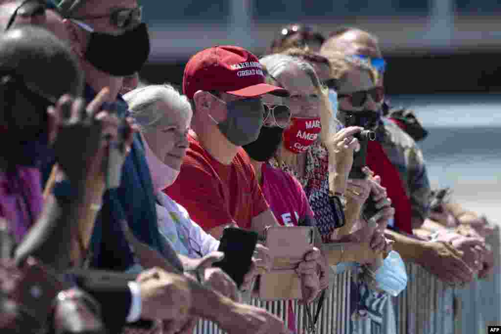 ក្រុមអ្នកគាំទ្រលោកប្រធានាធិបតី Donald Trump កាន់ទង់ជាតិអាមេរិកនិងបដា ខណៈលោក Trump ធ្វើដំណើរទៅដល់រោងចក្រ Whirlpool Corporation នៅទីក្រុង Clyde រដ្ឋ Ohio ថ្ងៃទី ៦ ខែសីហា ឆ្នាំ២០២០។